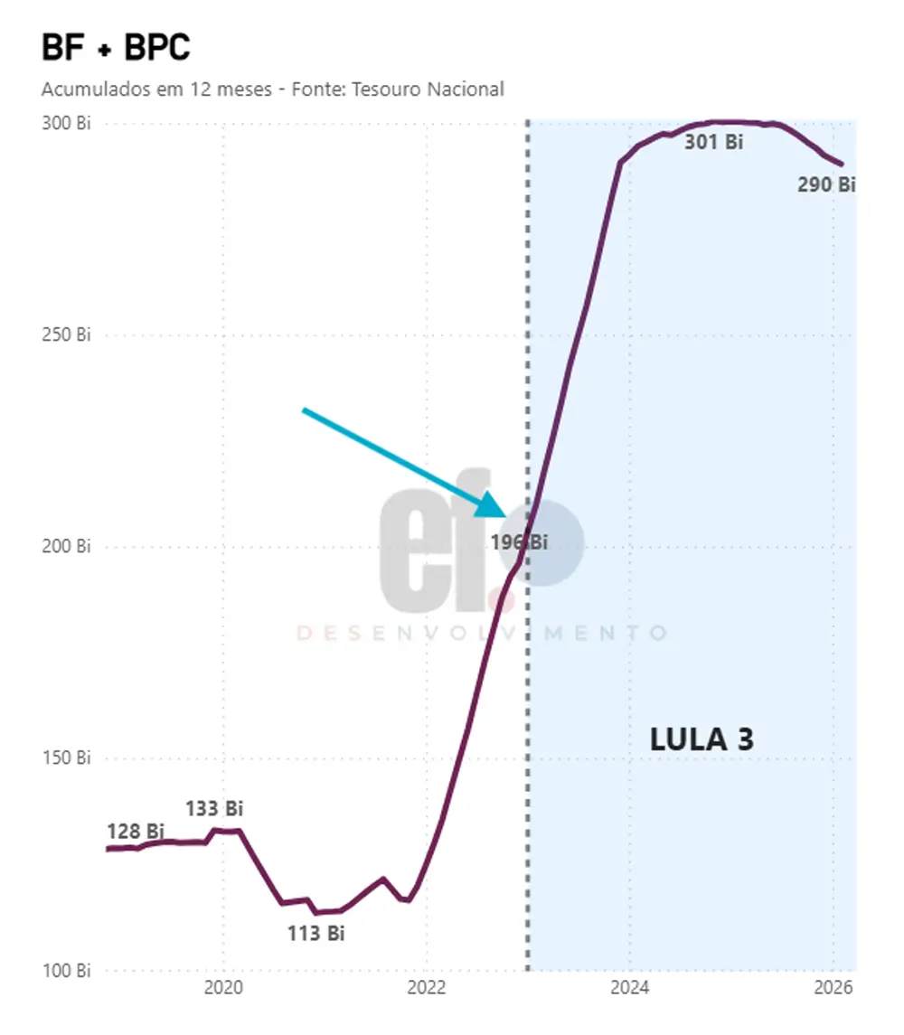 Interessante entender que o movimento do aumento dos benefícios se deu ainda em 2022, no governo anterior. Antes de Lula assumir, o acumulado de 12 meses de Bolsa Família e Benefício de Prestação Continuada (BPC) trazido a valor presente pelo Índice Nacional de Preços ao Consumidor Amplo (IPCA), já somavam quase R$ 200 bilhões. O governo seguinte, obviamente, só deixou o movimento continuar.